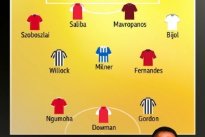 附迪尼英超第30轮最佳阵:拉姆斯代尔(纽卡);索博斯洛伊(利物浦)、萨利巴(阿森纳)、马夫罗帕诺斯(西汉姆)、比约尔(利兹联);威洛克(纽卡)、米尔纳(布莱顿)、B费(曼联);戈登(纽卡)、恩古莫哈(利物浦)、道曼(阿森纳)