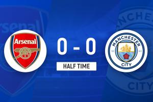 上半场伤停补时1分钟,半场结束,阿森纳暂0-0曼城。