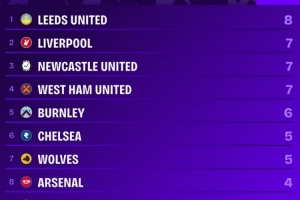 本赛季英超90分钟丢球榜:利兹联8球最多,利物浦7球并列次席